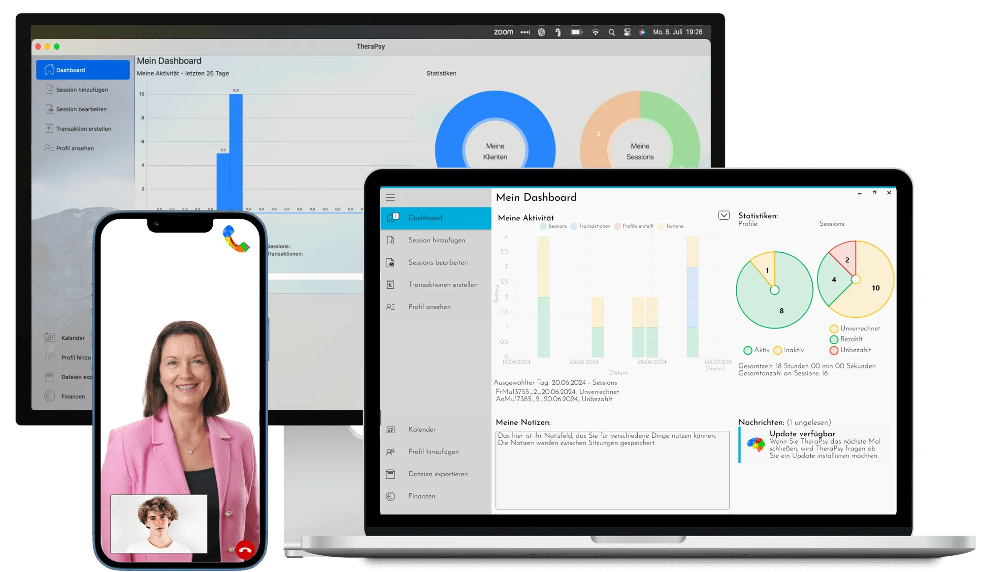 TheraPsy ist modular aufgebaut und kann an individuelle Praxisbedürfnisse angepasst werden – sowohl in der Funktionsauswahl als auch teilweise im Layout (z. B. eigene Vorlagen für Rechnungen und Bestätigungen).